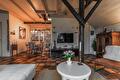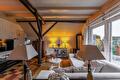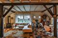 Van hieruit betreedt u de grote sfeervolle woonkamer met de mooie gebinten en balkenplafond die het landelijke gevoel van deze woning benadrukt. Ook wordt de living nog "warmer" door de gaskachel die zich in de hoek bevindt. Het terras is middels een schuifpui te bereiken. Er is een gezellige "leeshoek" gecreëerd nabij de trapopgang naar de verdieping.